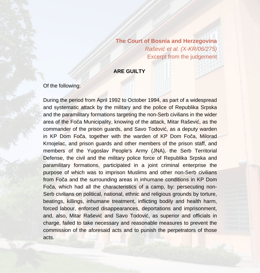 He was convicted by the Court of Bosnia and Herzegovina for crimes against humanity: persecution; murder; enslavement; deportation or forced displacement of the population; deprivation of physical liberty contrary to the basic rules of international law; torture; enforced disappearance and other inhumane acts of a similar nature, committed with the intent to cause great suffering, serious physical or mental injury or impairment of health.