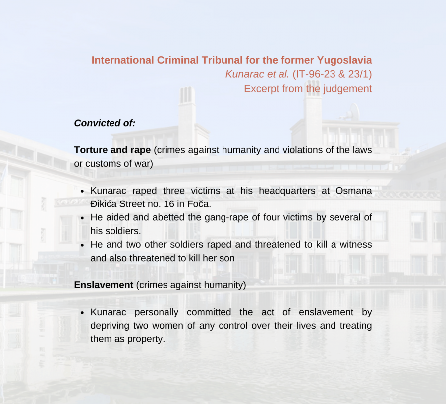He was sentenced in 2002 by the International Criminal Tribunal for the Former Yugoslavia (ICTY) to 28 years in prison for torture, rape and enslavement as crimes against humanity and war crimes. He is serving his sentence in Germany. In February 2017, the Mechanism for International Criminal Tribunals (MICT) rejected a request for the early release of Kunarac.